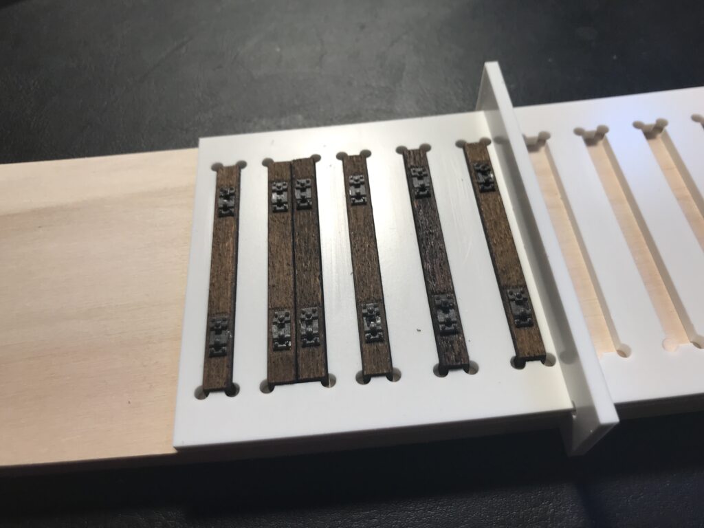 Die Schwellen können so sehr präzise eingelegt und verleimt werden. Die Lehren sind für einen schnellen Baufortschritt mehrfach vorhanden.